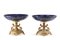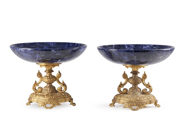 Coppia di alzate lastronate in marmo blu, base in bronzo dorato con piedi a roc