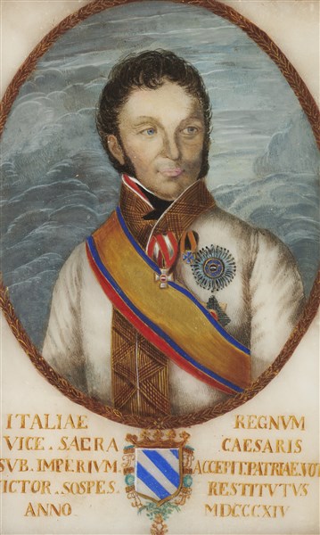 Iscritto "ITALIAE REGNUM / VICE. SACRA CAESARIS / SUB. IMPERIUM ACCEPIT. PATRIAE . VOTI.s / VICTOR SOSPES. RESTITUTUS / ANNO / MDCCCXIV"
