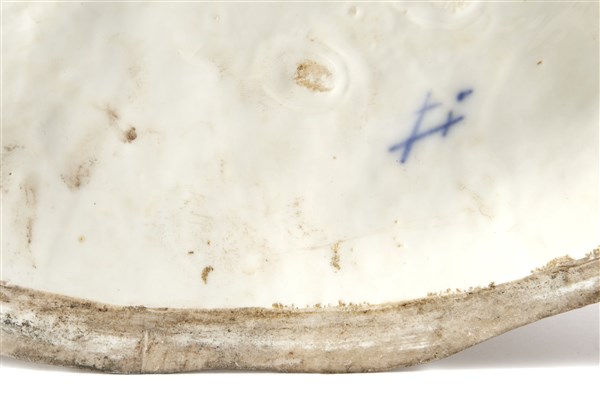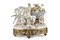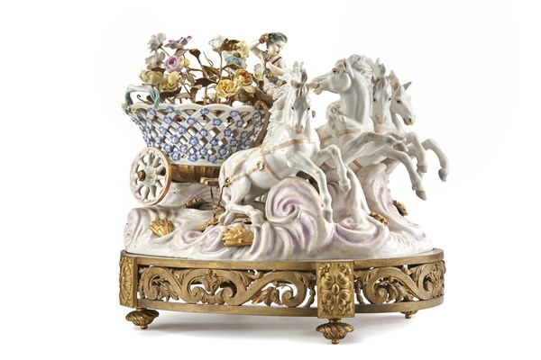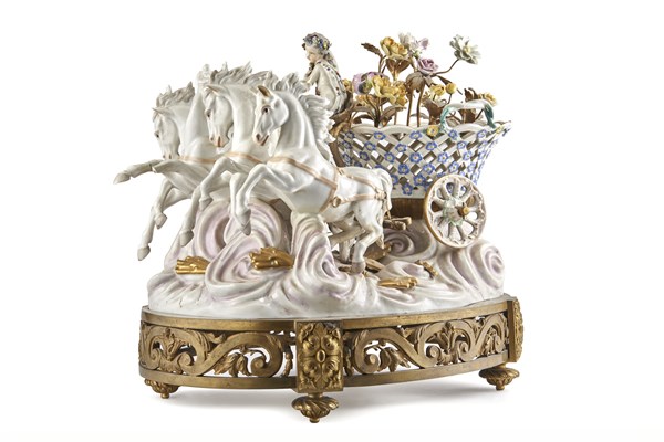 Gruppo in porcellana policroma raffigurante quadriga di cavalli su base a nuvole trainante biga con cesto biansato e traforato a rami fioriti e putto allegorico, montatura in metallo dorato. Manifatture ed epoche differenti, parte inferiore marcata. Poggiante su base ovale in bronzo traforato e dorato (cm 45x36x30) (mancanze, difetti e restauri)