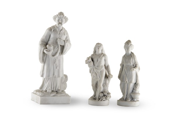 Manifattura diverse, secolo XIX. Tre figure in biscuit tra cui un brucia incenso a figura orientale e due figurette allegoriche (h. max cm 21) (difetti)