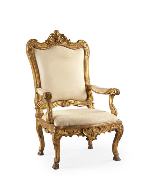 Poltrona in legno intagliato e dorato con schienale sagomato a volute, braccioli e gambe mosse terminanti a zoccolo. Secolo XVIII (difetti)