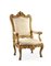 Poltrona in legno intagliato e dorato con schienale sagomato a volute, bracciol