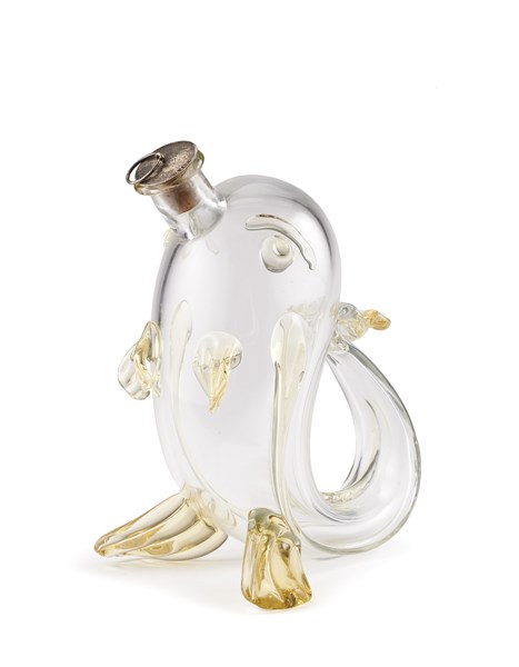 Lot 569 | Versatoio in foggia di delfino in vetro soffiato con tappo in sughero e argento