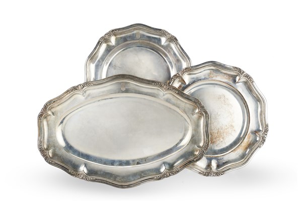 Lotto composto da due piatti e una pesciera di simil decoro in argento a bordo mosso a volute fogliate e valve di conchiglia, incisi con stesso stemma nobiliare nella falda. Uno marcato Musy Torino. Titolo 950. Fine secolo XIX (L. max cm 50,5) (g 3800) (difetti)