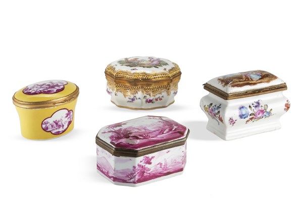 Manifatture diverse, secolo XIX. Quattro diverse tabacchiere in porcellana dell