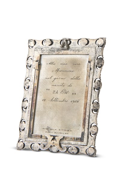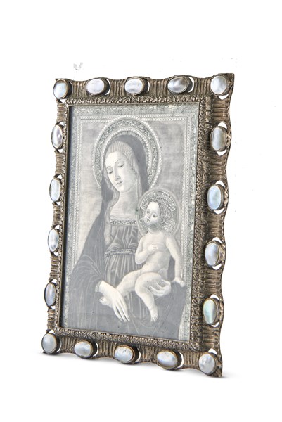 Mario Buccellati "Madonna con Bambino" miniatura incisa su lamina d'argento, entro cornice a cavalletto cesellata, traforata e decorata a cabochons. Iscritta al retro "Alla mia cara Mariuccia nel giorno della nascita di 24 Ore 12 settembre 1946 Incisa nella bottega di Mario Buccellati" (cm 7,5x9,5) In custodia (difetti)
