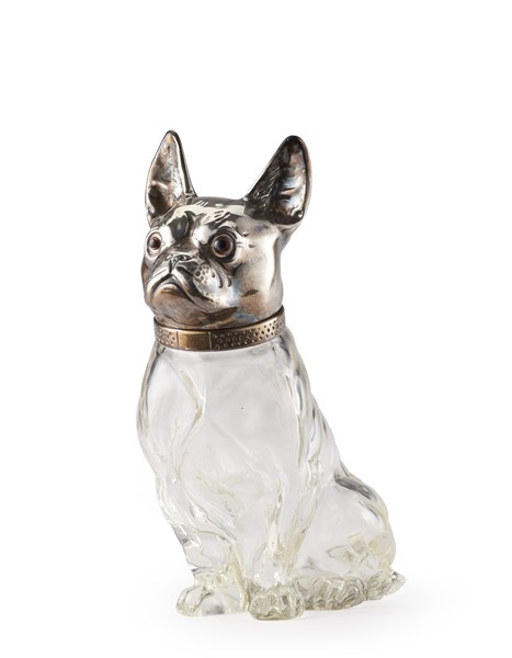 Bottiglia in vetro in foggia di bulldog con testa in argento e occhi in pasta vitrea. Austria, secolo XX (h. cm 20,5) (difetti)