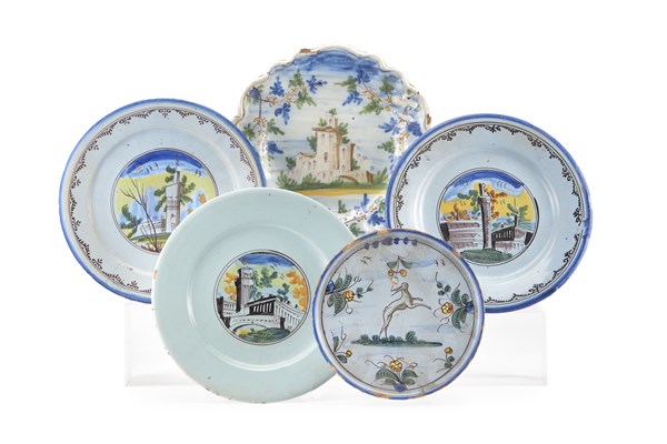 Manifattura di Pavia, secolo XVIII. Lotto composto da tre piatti ed una parte di alzata in maiolica a fondo berrettino con architetture e animali, uniti ad un piatto a profilo mistilineo con architettura della manifattura di Lodi, secolo XVIII (d. max cm 25) (difetti e restauri)