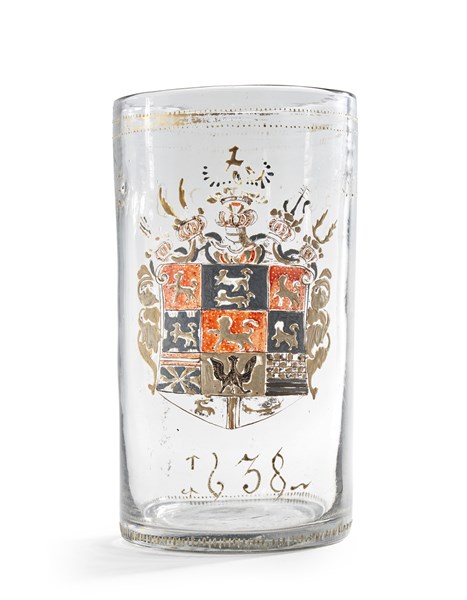 Manifattura austriaca, secolo XVII. Vaso in vetro decorato a freddo in policromia e dorature a stemma araldico, iscrizioni e data 1638 (h. cm 25,5) (difetti alla pittura)