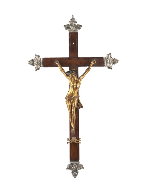 Arte del secolo XVIII. Crocefisso in bronzo dorato su croce lignea con puntali in argento sbalzato a volute (cm 54x30,5) (difetti)