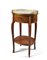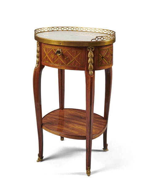 Tavolino ovale da centro lastronato in amaranto e palissandro, intarsiato a marquetterie e legno tinto di verde, cassetto sul fronte che rivela scrittoio e vani, piano in marmo incassato con galleria traforata e applicazioni in bronzo, gambe mosse riunite da pianetto. Francia, fine secolo XVIII (cm 42x73x33) (difetti)