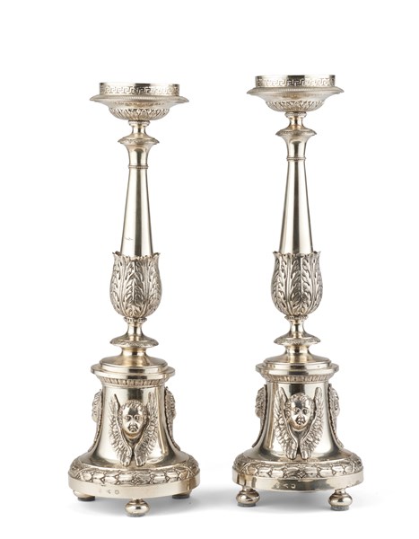 Pair of silver candlesticks. Silversmith G. Sacchi e figli. Milano, 1820 ca. (h. cm 34,5 ca.) (defects)