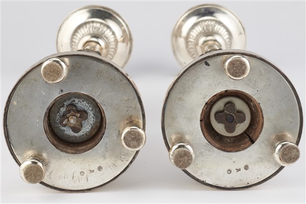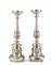 Coppia di candelieri in argento decorati a motivi fogliati nella bobeche e nel