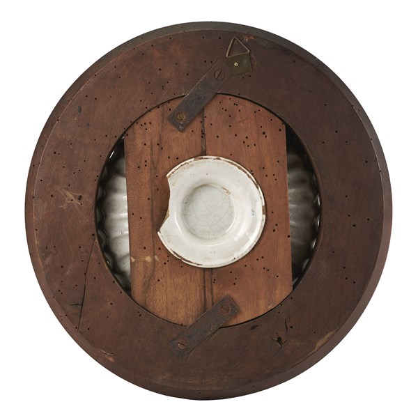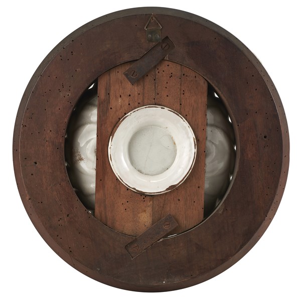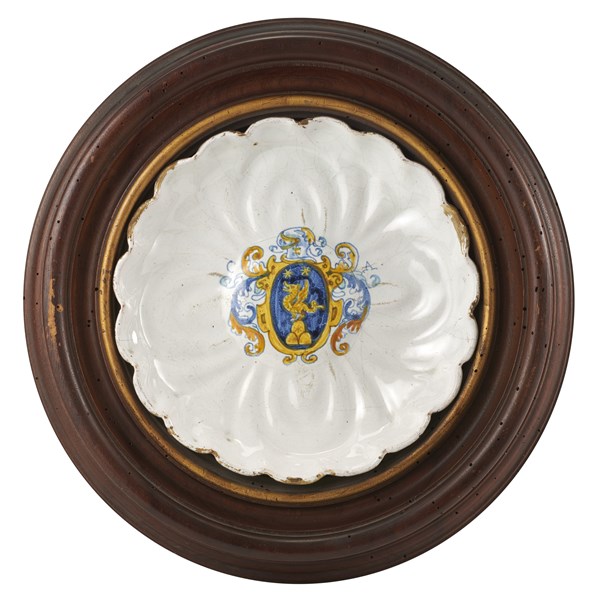 Manifattura del secolo XVII. Due crespine in maiolica bianca decorata nel cavetto da stemma araldico in policromia (d. cm 23; d. cm 22) in cornici di epoca successiva (difetti e restauri)