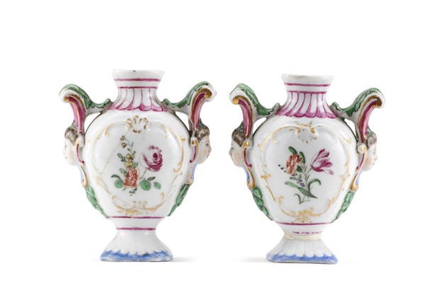 Manifattura del secolo XVIII. Coppia di piccoli vasi biansati a volti muliebri in porcellana con decoro policromo a fiori e profilo in oro (h. cm 7,5) (difetti e restauri)
