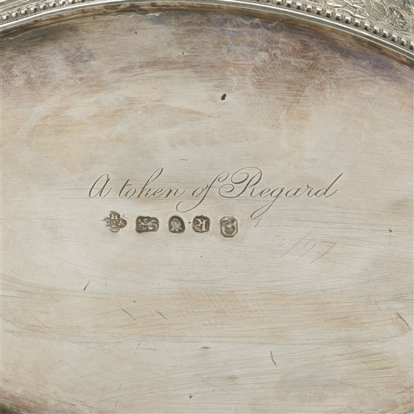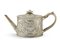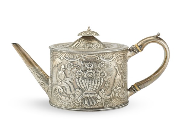 Teiera in argento inciso e sbalzato con decoro a chinoiserie con vaso di fiori, pavoni e figure, ansa sagomata con ghiera in osso. Recante punzoni inglesi (cm 25x15) (g lordi 530) (difetti; sbalzata in epoca posteriore)
