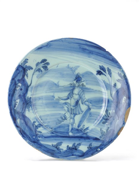 Manufacture Conrado (attr) Albisola, 18th century. Majolica plate painted in shades of blue centered by soldier within landscape. Marked B.C on the back (d. cm 30) (defects)