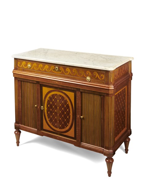 Credenza lastronata e intarsiata in legni di varie essenze, fronte con doppia serrandina celante tiretti e anta centrale, un cassetto sottopiano, gambe rastremate e scanalate. Piano in marmo bianco. Olanda, fine secolo XVIII (cm 107x92,5x49,5) (difetti)