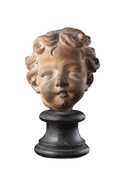 Maestro del secolo XVIII "Testa di fanciullo" scultura in terracotta poggiante su base in legno tornito ed ebanizzato (h. cm 23) (lievi difetti)