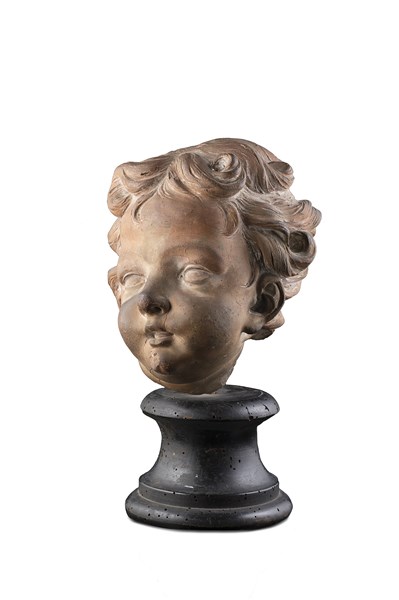 Maestro del secolo XVIII "Testa di fanciullo" scultura in terracotta poggiante
