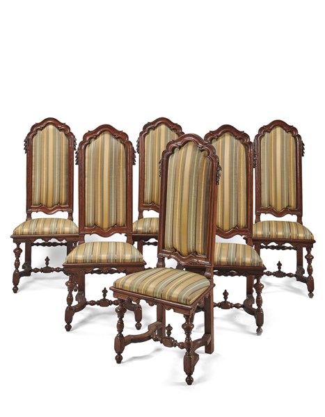 Gruppo di dodici sedie in noce con alto schienale polilobato e intagliato, gam