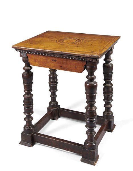 Tavolino in noce filettato in legno chiaro, piano intarsiato a stemma nobiliare, profilo dentellato ed un cassetto nella fascia, gambe intagliate a rocchetto con traverse di raccordo. Secolo XVII (cm 68x78x61) (difetti e restauri)