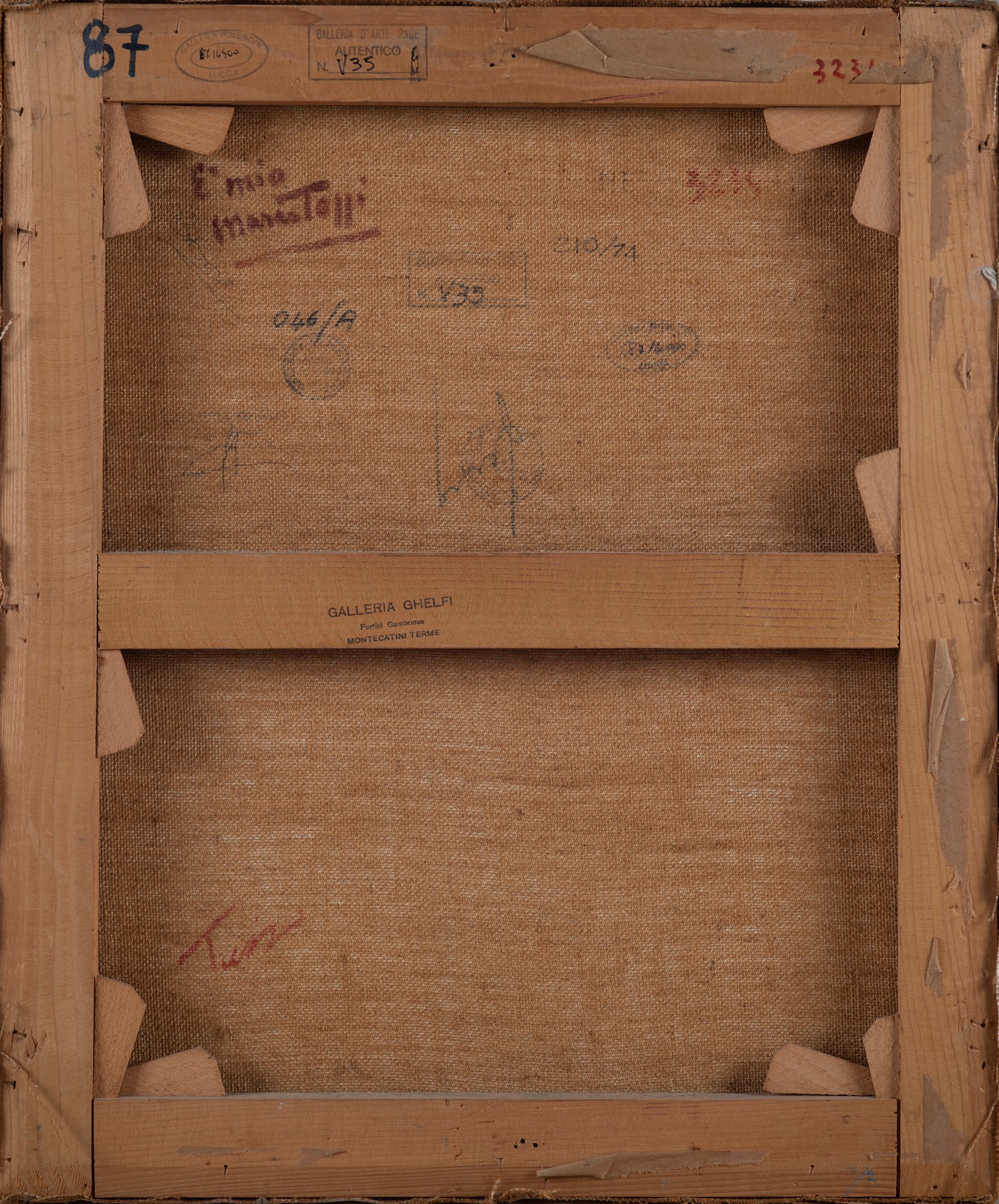 La cornice del dipinto è stata ideata e disegnata dal Maestro per le sue opere ed è stata realizzata dal corniciaio artigiano Malerba di Milano, in legno e patinata in gesso.
