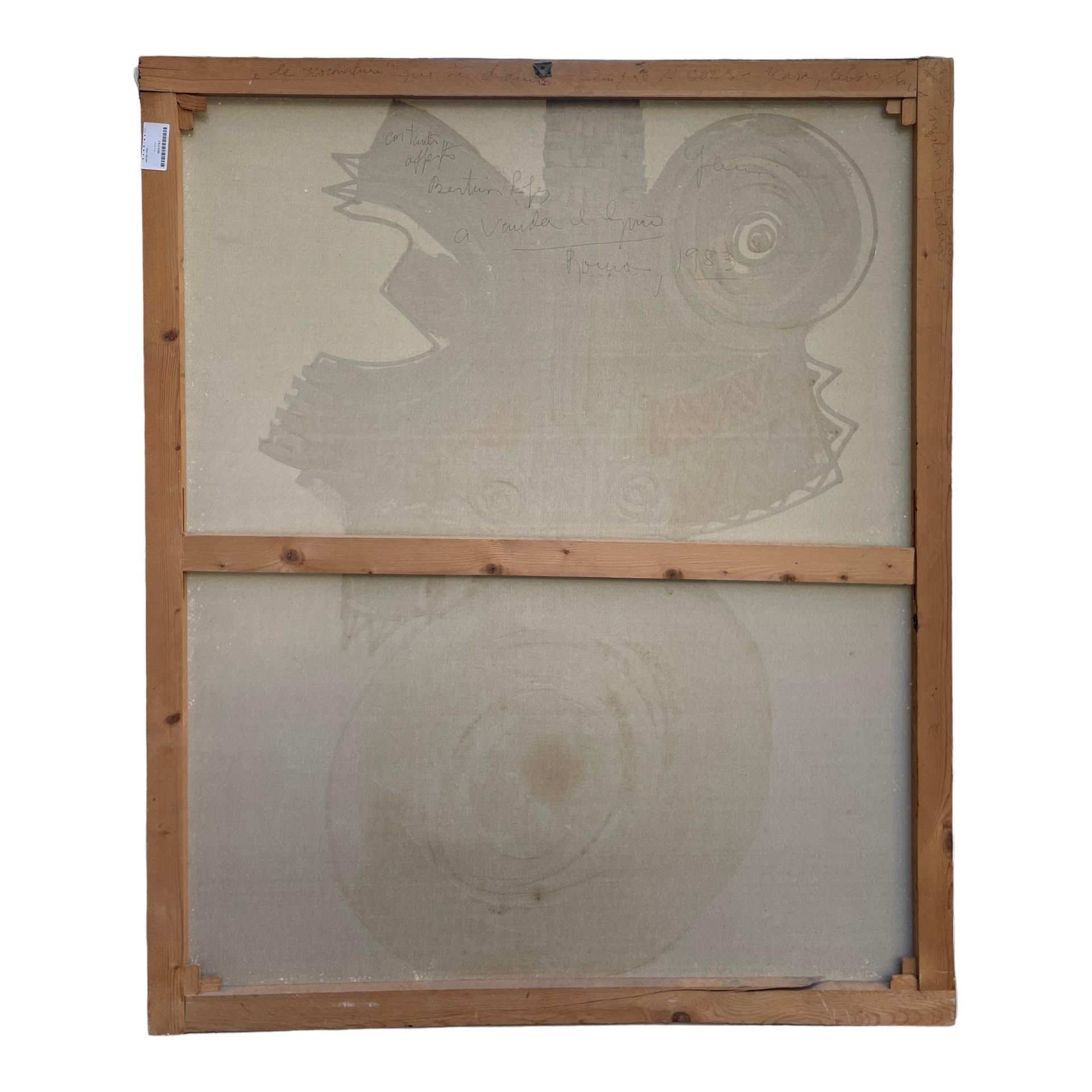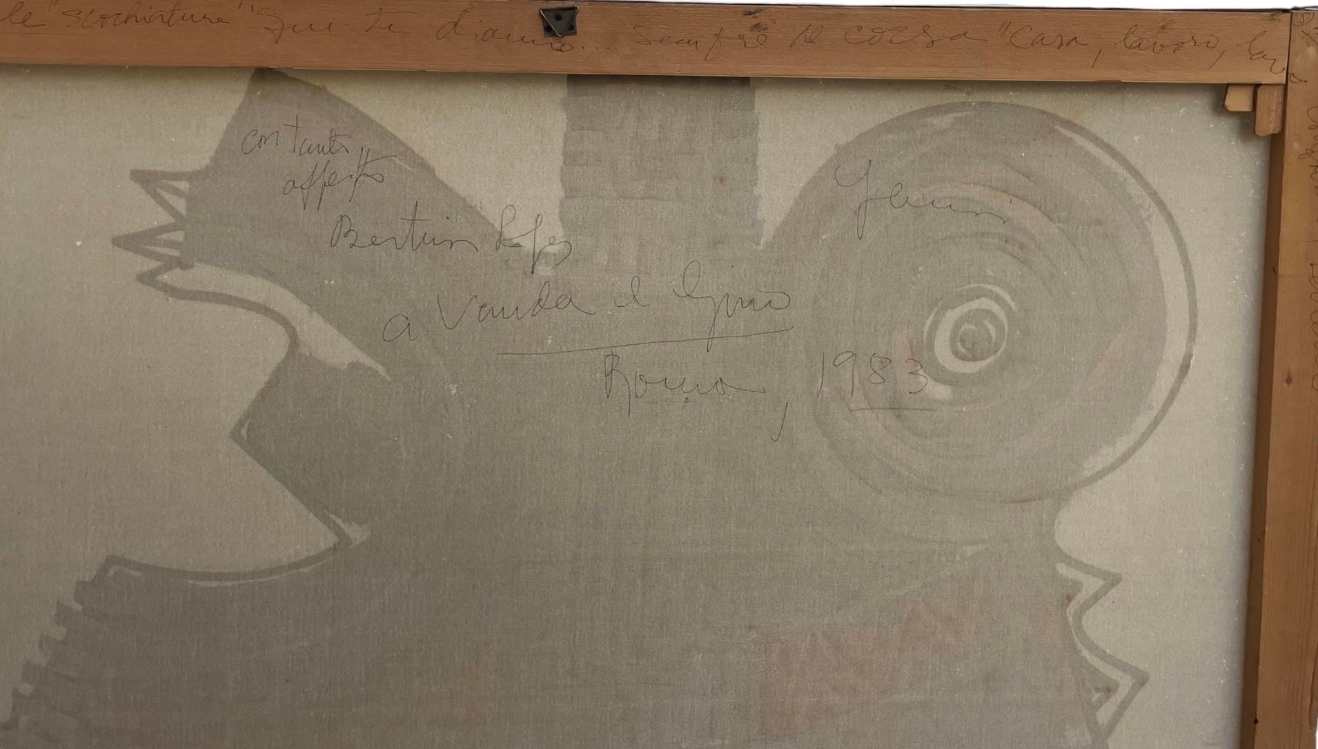 tecnica mista su tela 120 x 100 cm. Firmato e datato in alto a destra: bertina (83). Firmato, dedicato e datato al retro. Scritte sul telaio.