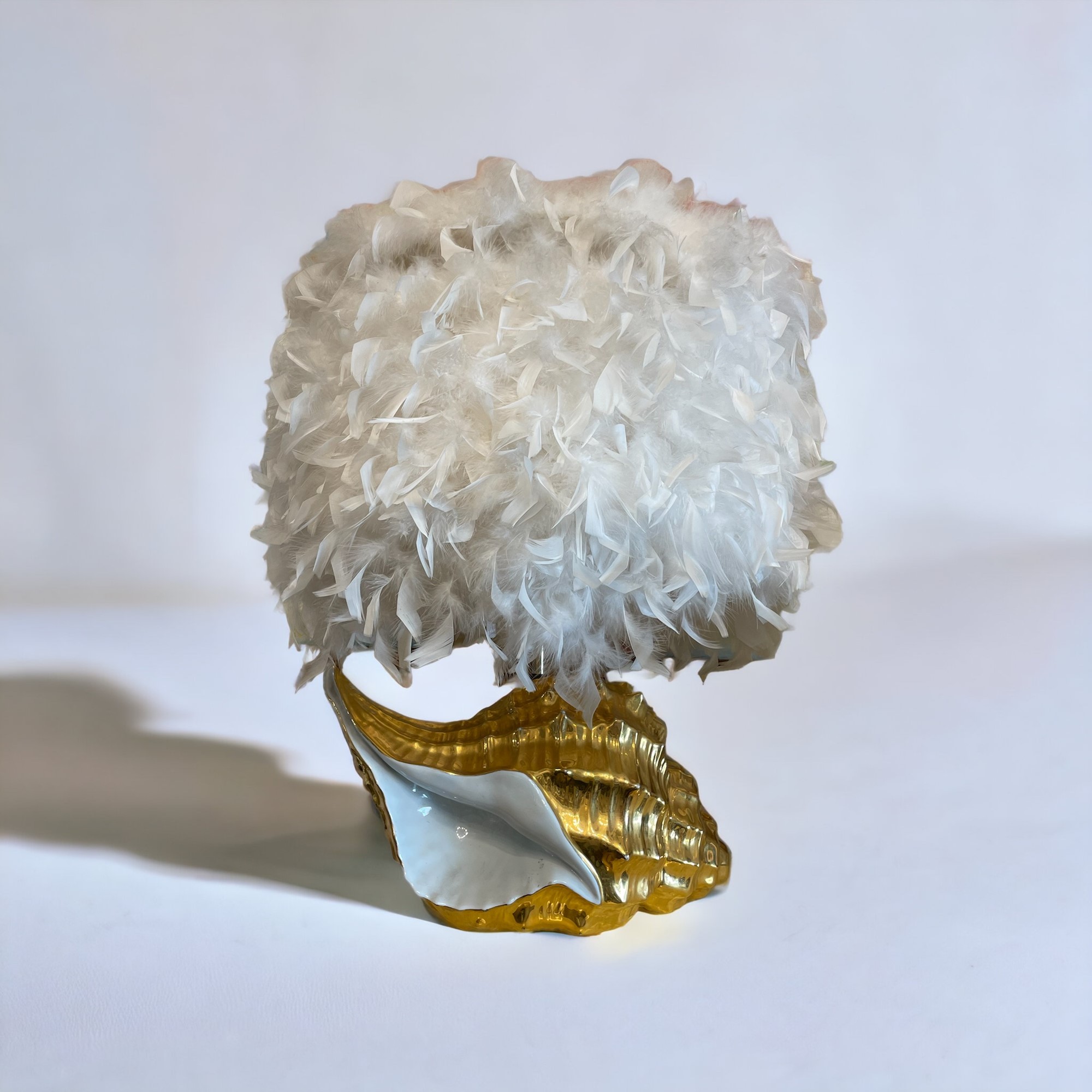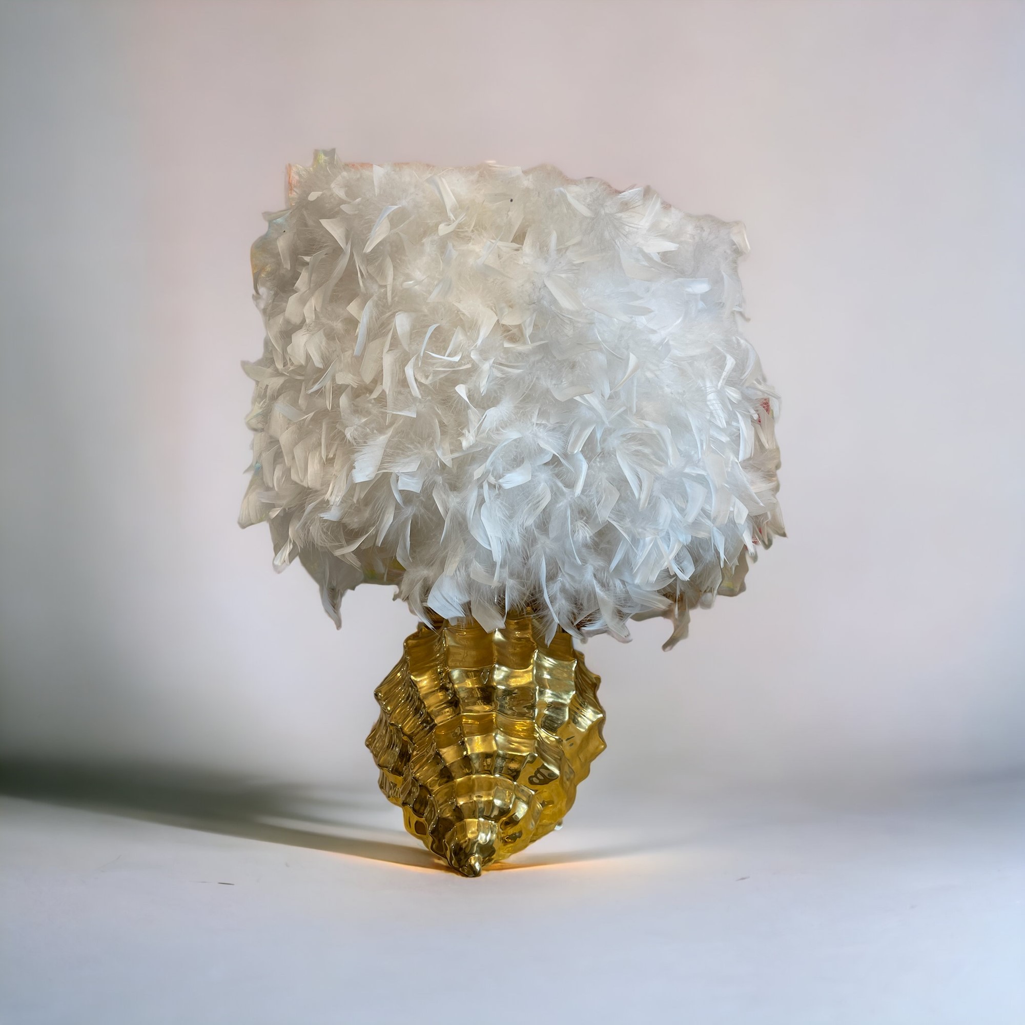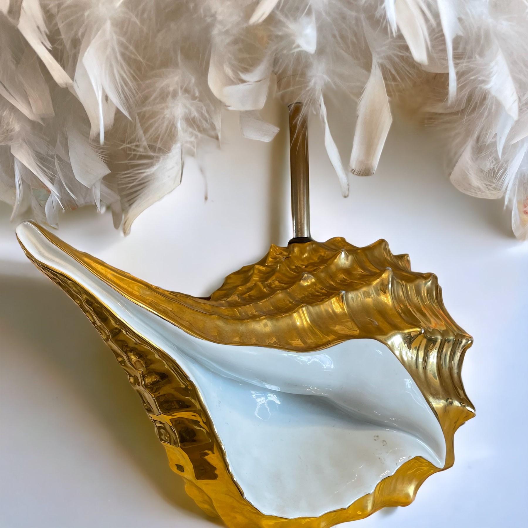 porcellana dorata e piume . Nello stile Principessa Borghese, a forma di conchiglia con paralume con piume.