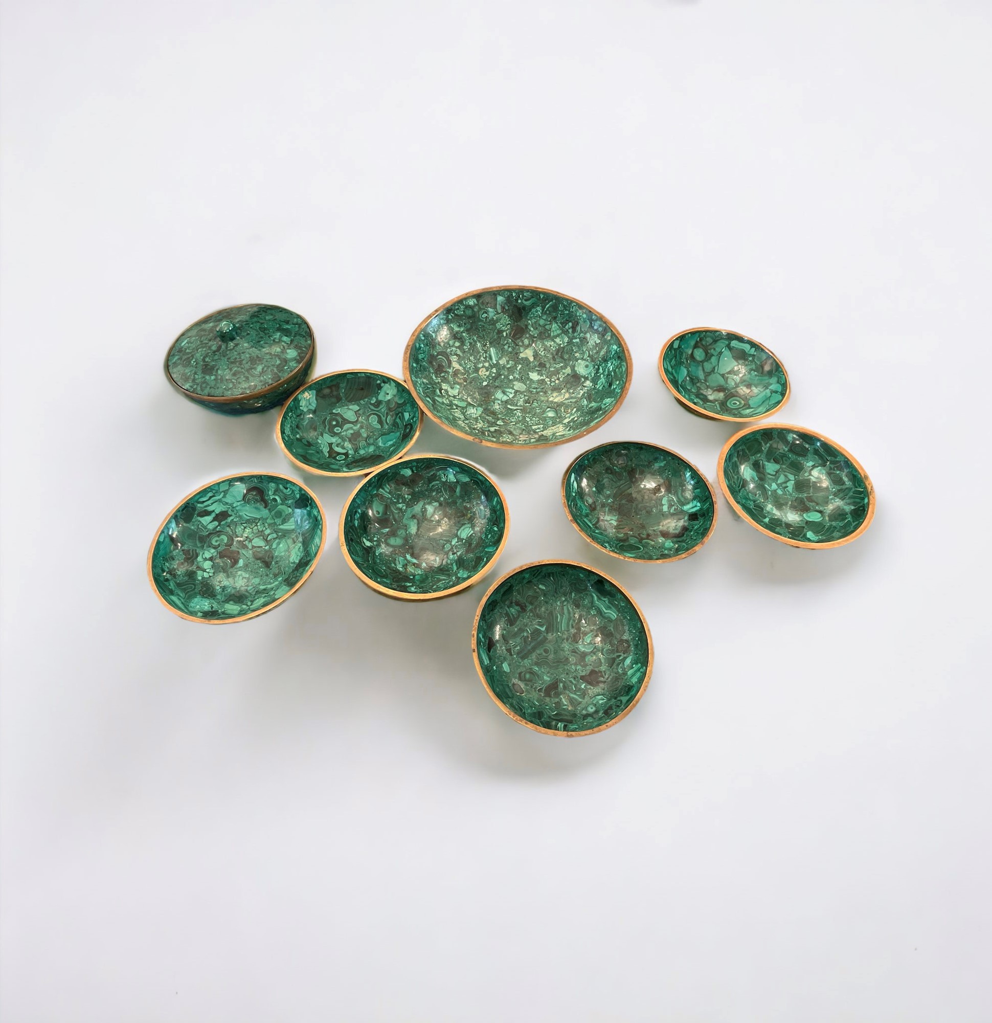 Servizio in malachite . Composto da una grande ciotola ( 8 x 27 cm), una ciotola (5,5 x 17 cm), sei ciotole (5 x 16,5 cm) e un ciotola con coperchio (7 x 17cm).