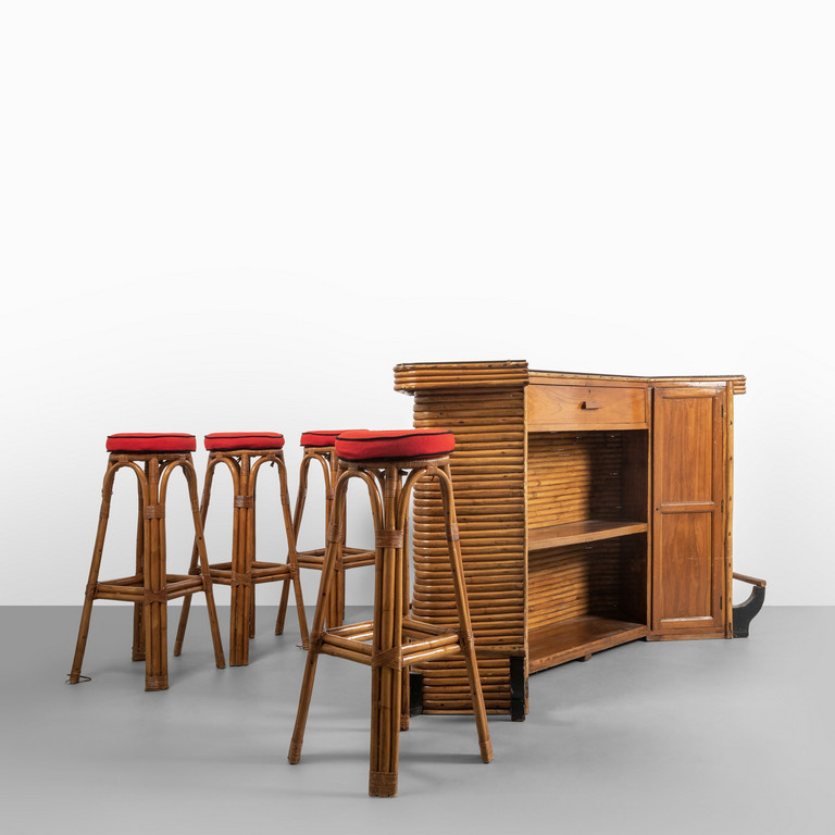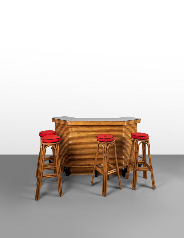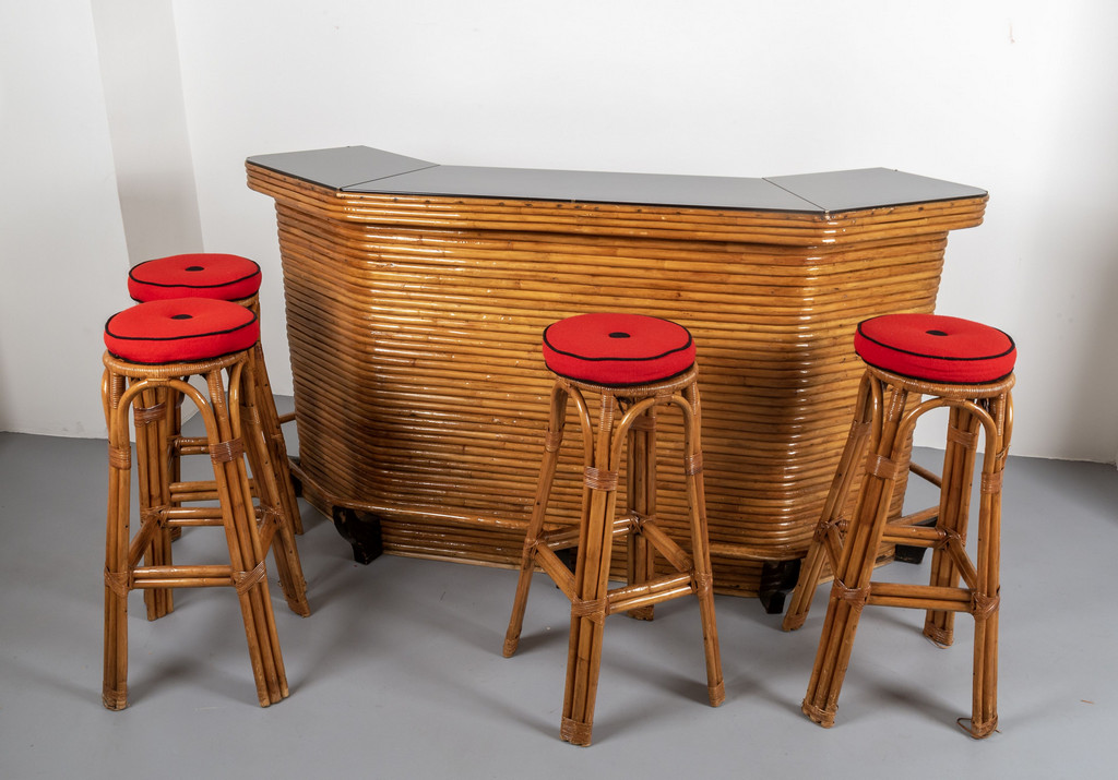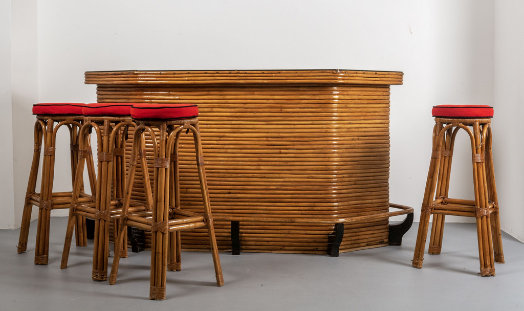 Un mobile bar e quattro sgabelli.
