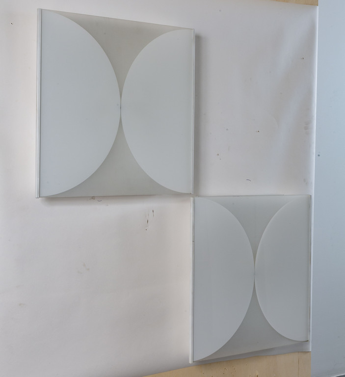 Lamierino di ferro verniciato vetro diffusore bianco lucido con decorazione smerigliata.