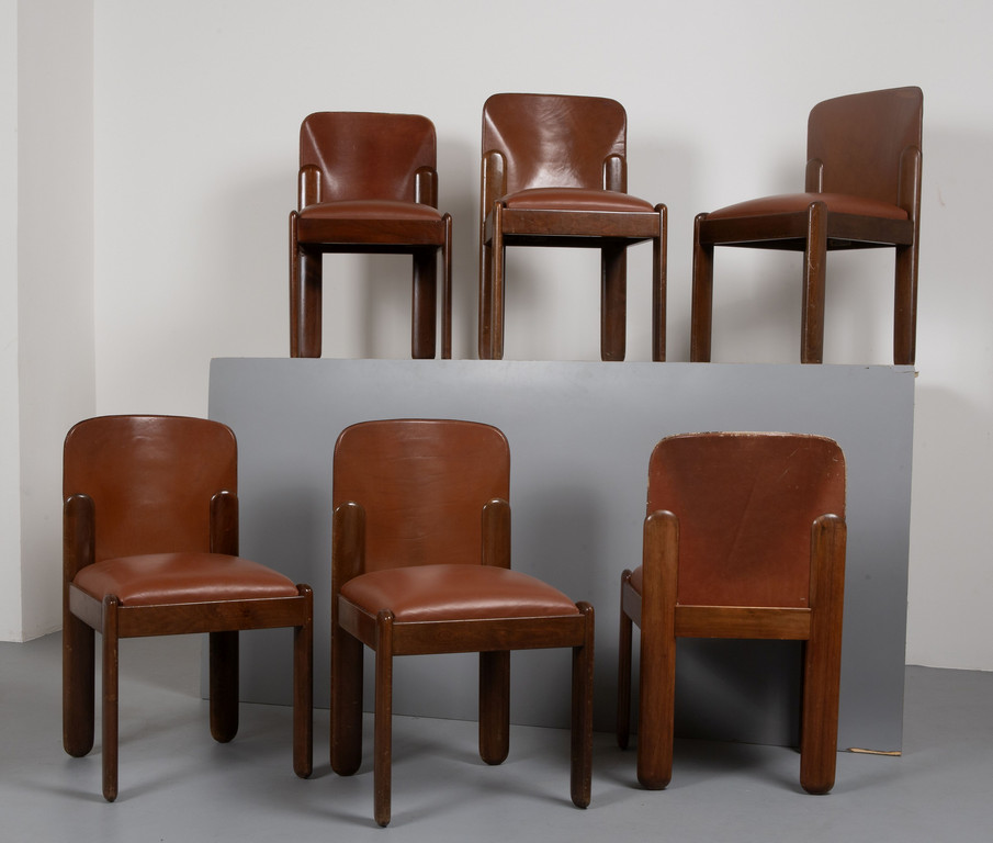 Legno di faggio tinto all'anilina sedute rivestite in vinilpelle (non originale) e schienali rivestiti in pelle.