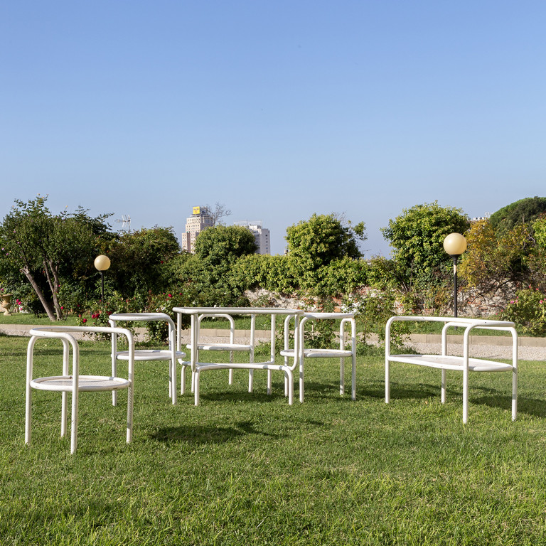 Un tavolo quattro poltroncine ed un divanetto della serie 'Locus Solus'.