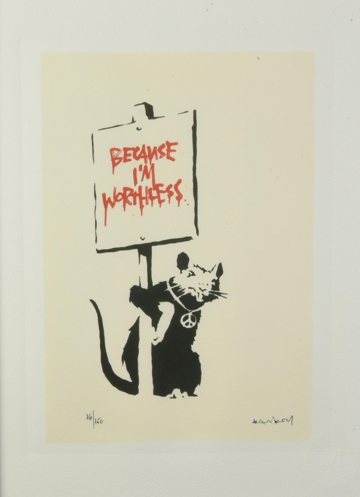 Da Banksy BECAUSE I'M WORTHLESS eliografia su carta Arches, cm 38x28; es....