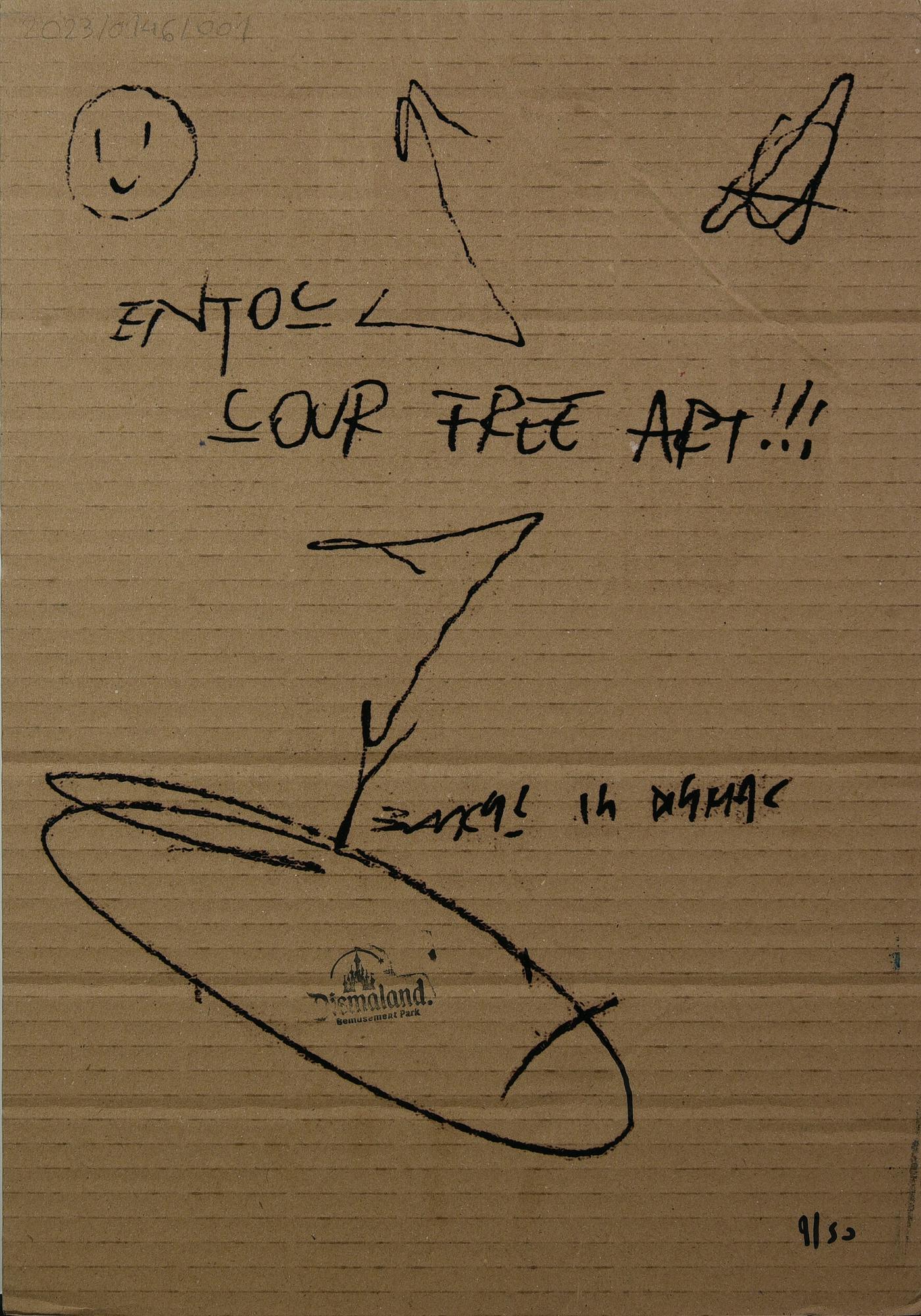 sul retro: tiratura, timbro Dismaland e iscritto "Enjoy your free art!!! Banksy is Dismal"