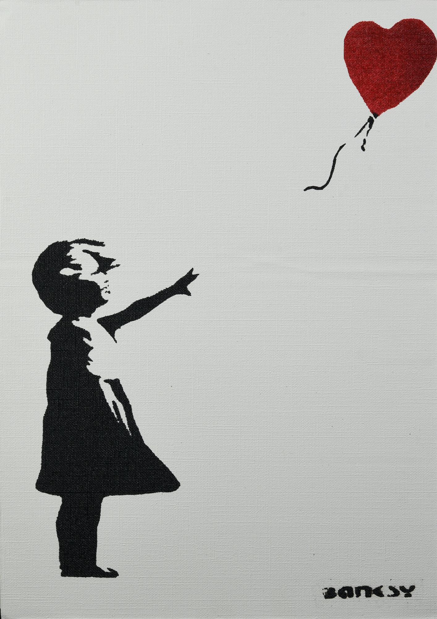Banksy GIRL WITH BALLOON, 2015 spray stencil su cartone intelato, cm 42x30;...