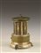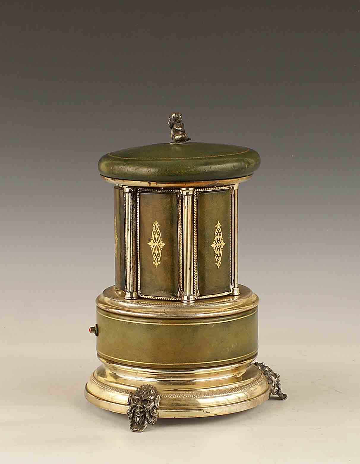 Lot 757 | Particolare carillon portasigarette in metallo e cuoio, h. cm. 27.