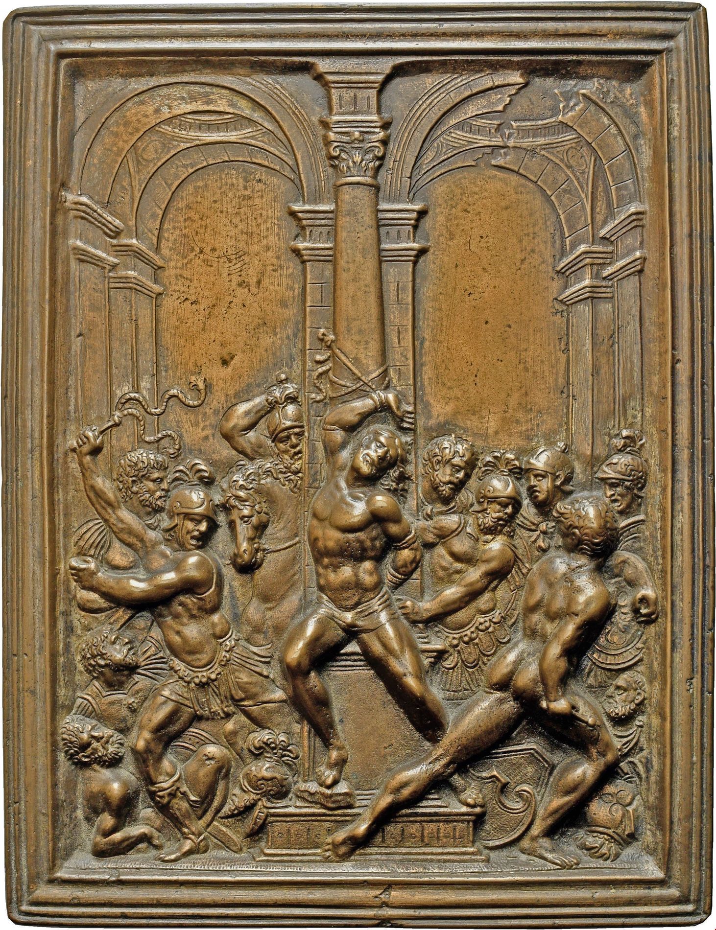 Al centro, Gesù Cristo legato ad una colonna sopra ad un basamento: viene flagellato da un soldato vestito alla romana e da un uomo nudo. A destra: dietro, 4 figure maschili militari romani ed una figura maschile nell’ angolo basso; a sinistra, un cavaliere e tre figure maschili barbute. Sopra il basamento un elmo con testa e un viso con lunga barba Sullo sfondo, due grandi archi, quello a destra spezzato. Bellissima fusione da prototipo originale.