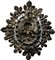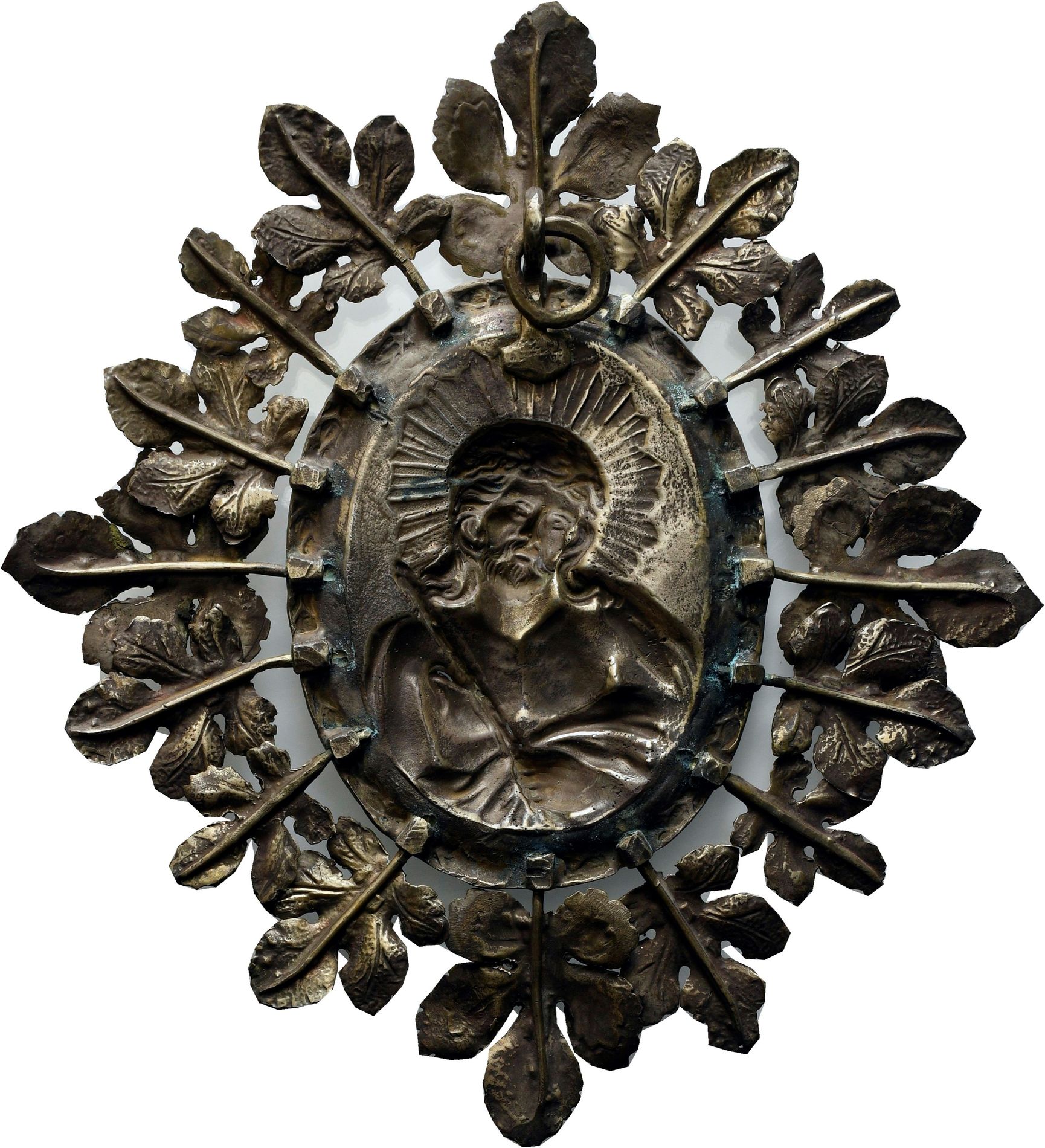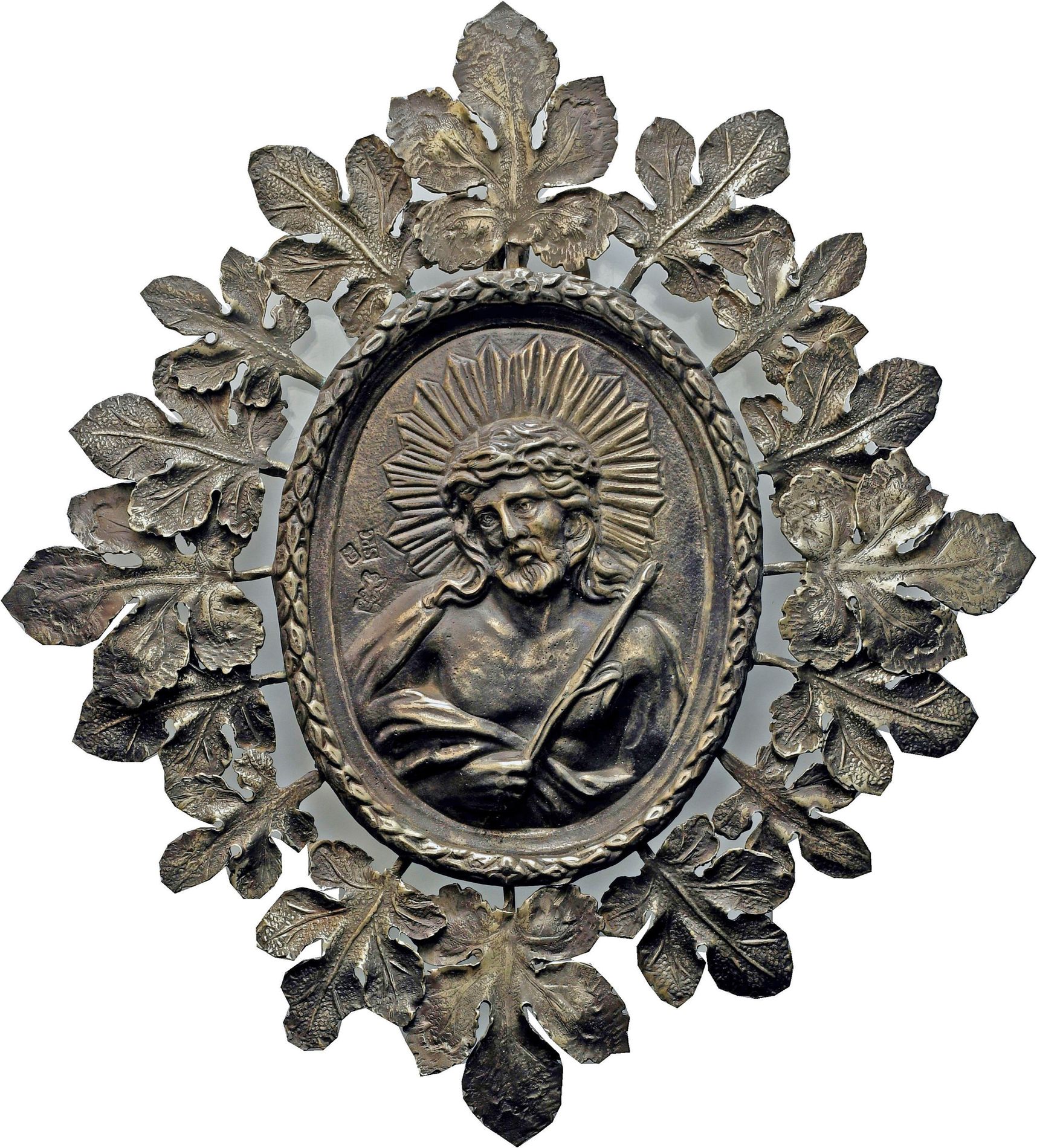 Gesù Cristo a mezza figura, frontale, con corona di spine e canna sul petto; fondo puntinato, contornato da foglie. A sinistra punzoni dell’orafo.