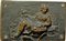 Figura femminile seduta sopra un masso con un uccellino nella mano destra e un cesto di frutta nella sinistra. Sfondo con nuvole. Bella fusione antica