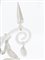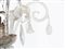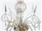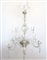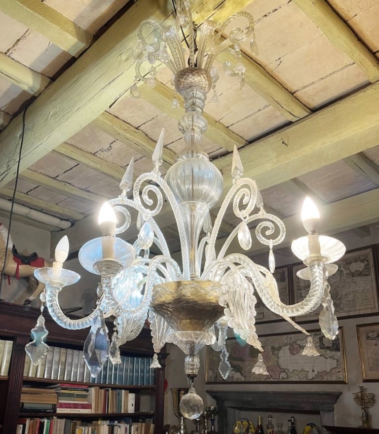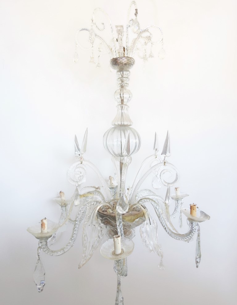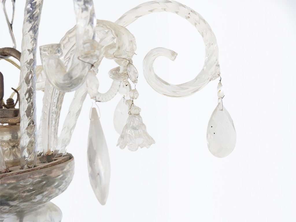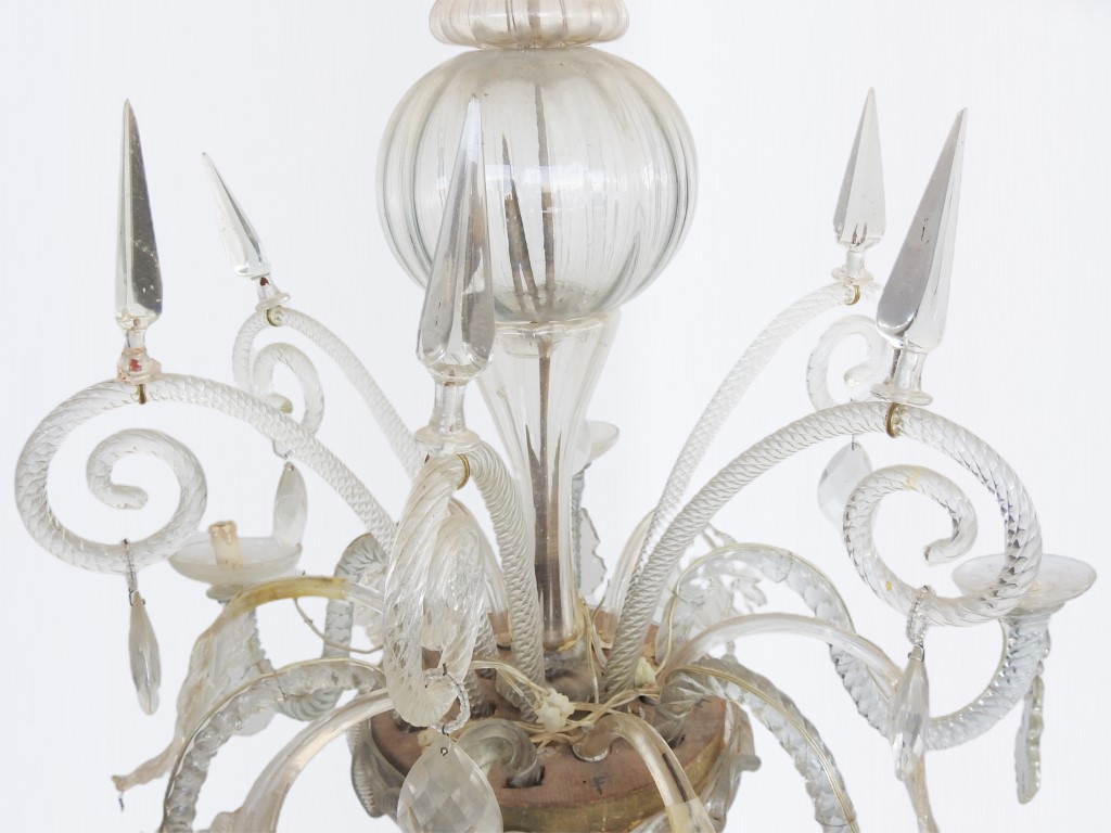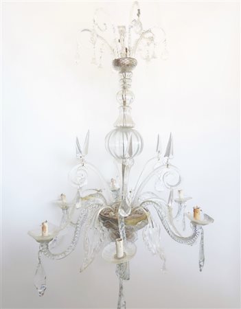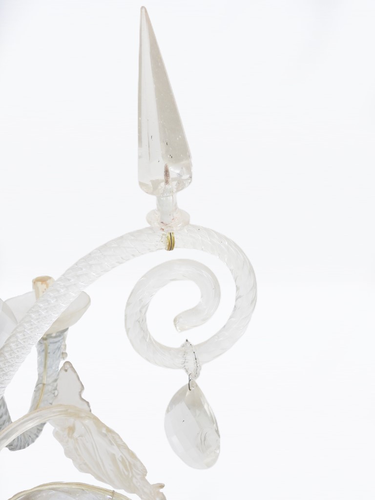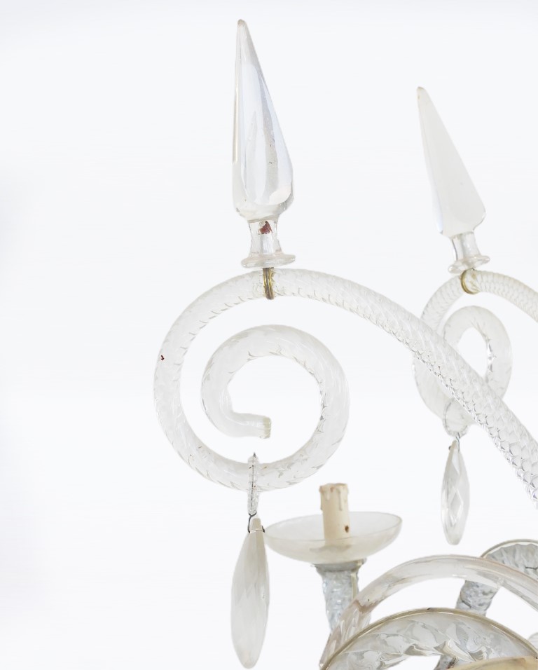 Realizzato in vetro incolore, bracci a tortiglione e pinnacoli sfaccettati; parte superiore con elementi ritorti con pendenti a goccia e a fiore stilizzato, sei bracci curvilinei nella parte sottostante e sei elementi a voluta con pinnacoli sfaccettati alla sommità