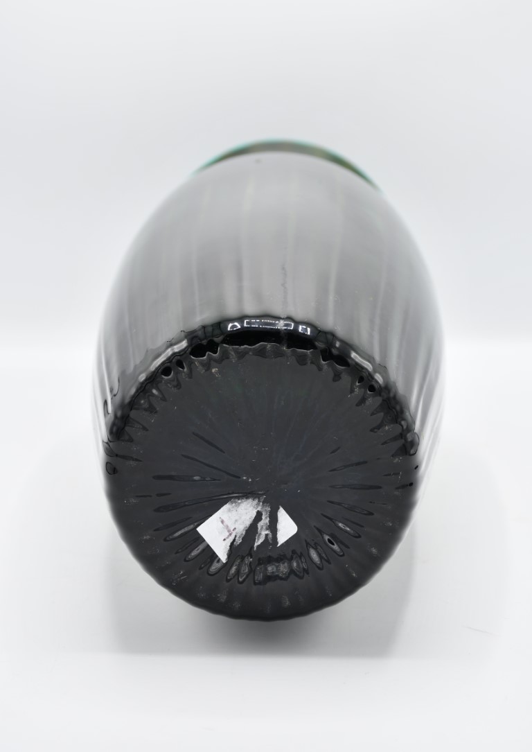 Realizzato in vetro di color verde scuro e con decoro a canne verticali