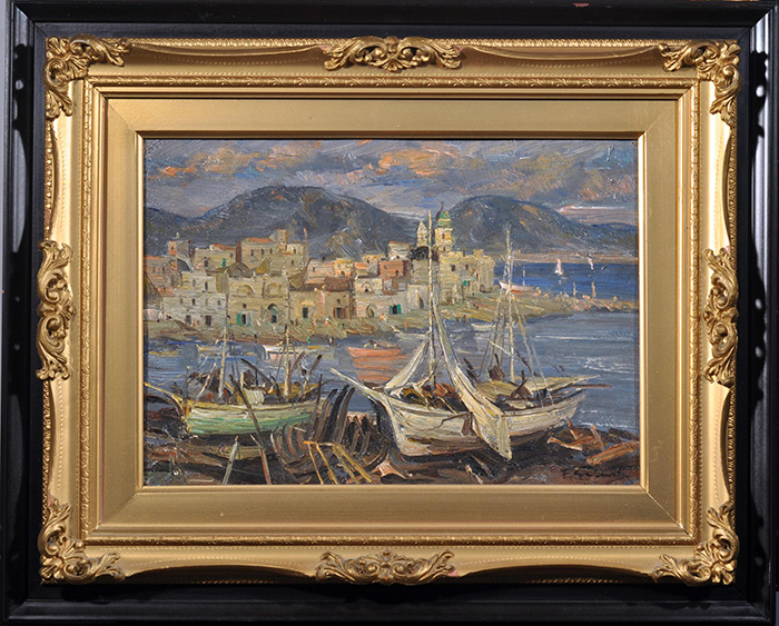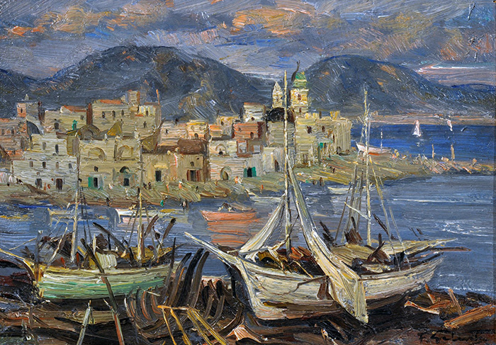 Galante Francesco (Margherita di Savoia, FG 1884 - Napoli 1972) Rodi Garganico olio su tavola, cm 25x35 firmato in basso a destra: F. Galante
