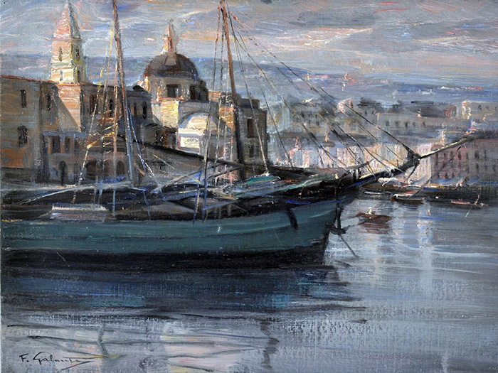 Galante Francesco (Margherita di Savoia, FG 1884 - Napoli 1972) Nel porto olio su tela, rip. cartone cm 30x40 firmato in basso a sinistra: F. Galante