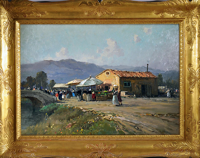 De Corsi Nicolas (Odessa, 1882 - Napoli, 1955) Paesaggio con figure olio su tavola, cm 50x70 firmato e datato in basso a sinistra: De Corsi 1916