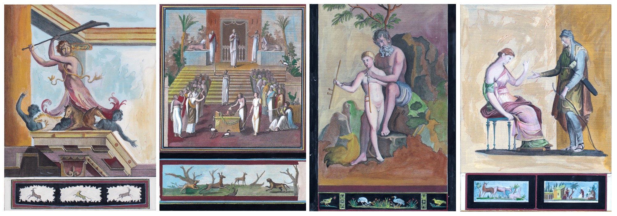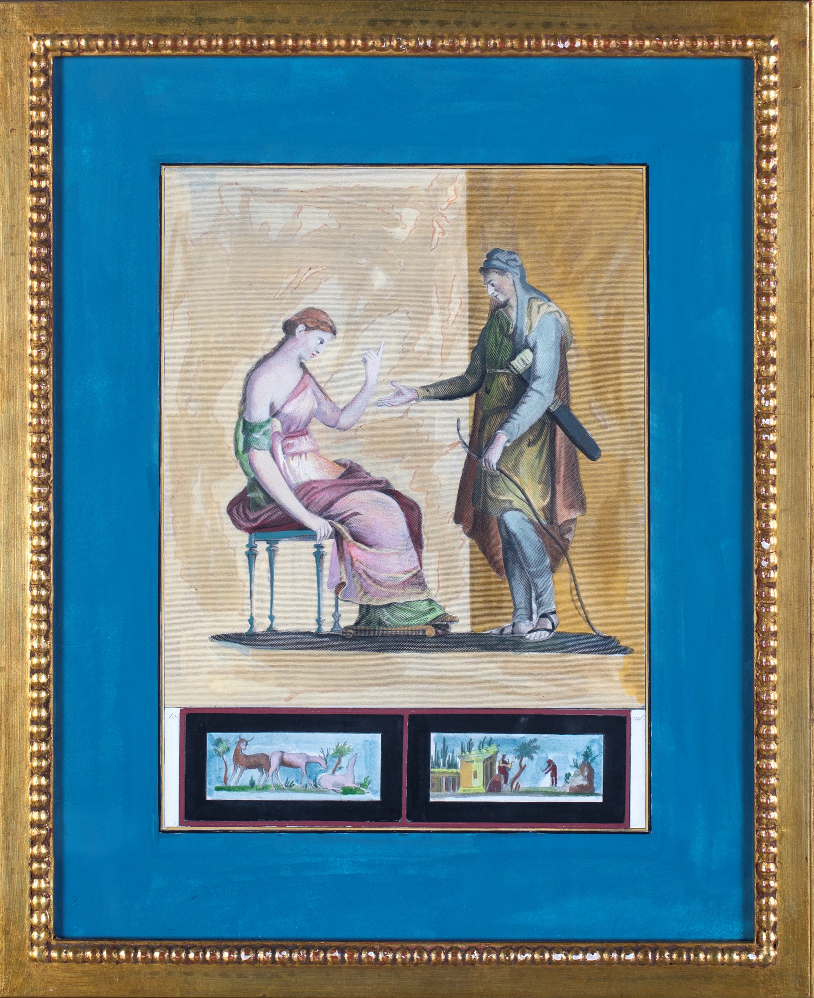 Quattro incisioni acquerellate, fine del XVIII secolo da "le Antichità di Ercolano esposte". Pietro Campana (1725 - 1765) incisore - Niccolò Vanni (notizie 1750 - 1770 ca.) disegnatore acquaforte acquerellata a mano 33x23 - con la cornice: cm 49x40