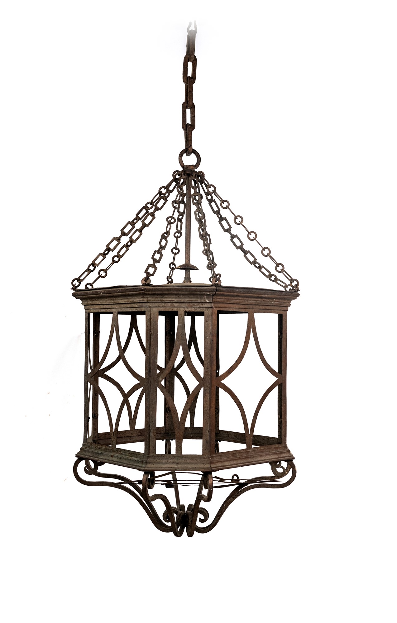 Antica lanterna in ferro struttura ottagonale con specchiature centrate da losanga, sorretta da catene riunite alla sommità
