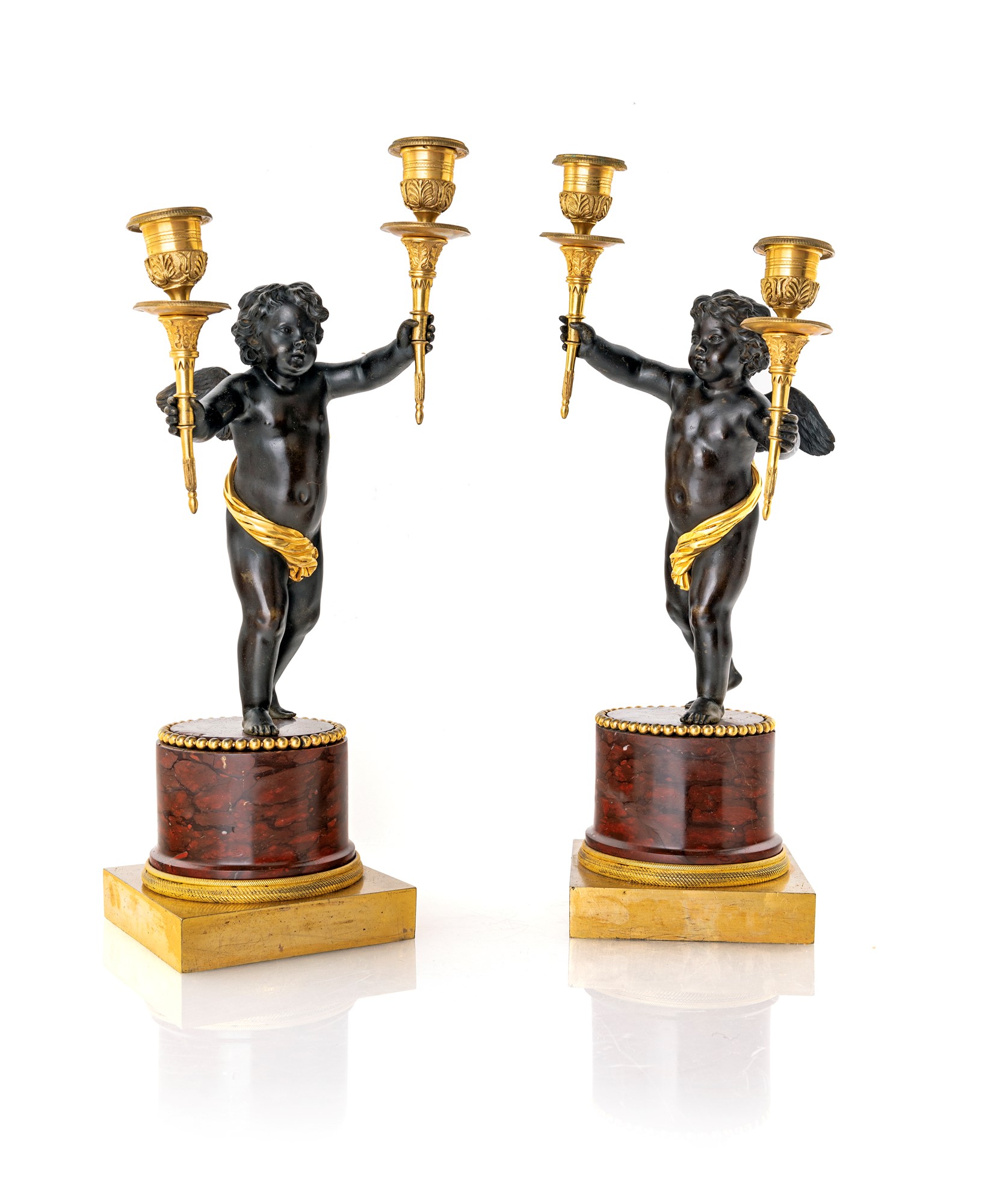 Coppia di doppieri in bronzo brunito e dorato, XIX secolo
