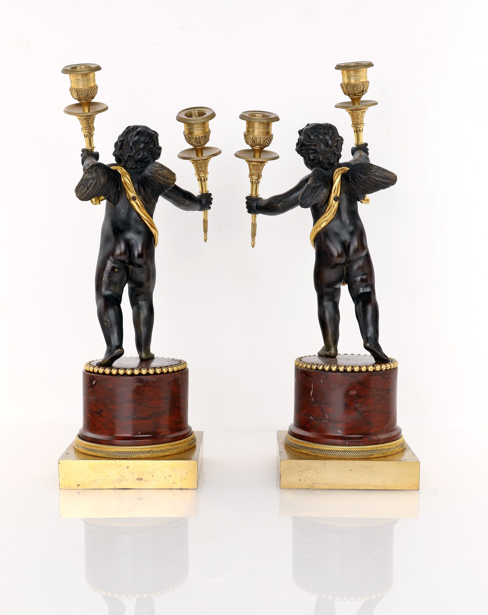 Coppia di doppieri in bronzo brunito e dorato, XIX secolo con reggicandela sorrette da figure di amorino stante su piedistallo a rocchio di colonna in marmo rosso altezza cm 44